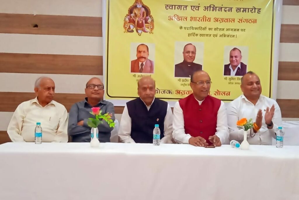सोलन : ग्रवाल सभा सोलन की तरफ से अखिल भारतीय अग्रवाल संगठन के पदाधिकारियों का सोलन आगमन पर एक समारोह के दौरान गर्मजोशी से स्वागत व अभिनंदन किया गया। इस अवसर पर अखिल भारतीय अग्रवाल संगठन के राष्ट्रीय चेयरमैन प्रदीप मित्तल, राष्ट्रीय मंत्री अशोक गर्ग,अखिल भारतीय अग्रवाल संगठन के नवनियुक्त हिमाचल प्रदेशाध्यक सुमित सिंगला, हरियाणा के प्रदेश अध्यक्ष सुरेश गर्ग विशेष अतिथि के रूप से उपस्थित रहे । इस अवसर पर अग्रवाल सभा के प्रधान दिनेश गर्ग, वरिष्ठ उपप्रधान सतीश बंसल व महासचिव राकेश अग्रवाल ने पदाधिकारियों का हिमाचली टोपी व शाल पहनकर स्वागत किया।
