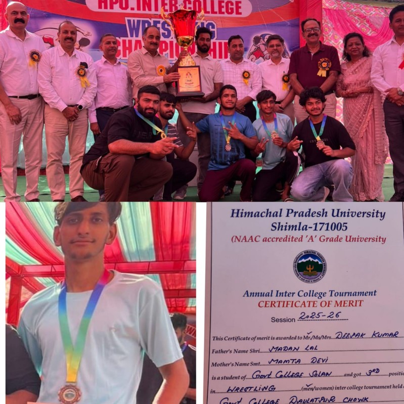 लाइव हिमाचल/सोलन: हिमाचल प्रदेश यूनिवर्सिटी की 2 दिवसीय इंटर कॉलेज कुश्ती प्रतियोगिता ऊना के दौलतपुर कॉलेज में सम्पन्न हुई। ग्राम पंचायत अन्हेच के कोटी शमलेच गांव के दीपक कुमार ने 57 किलोग्राम वर्ग में कांस्य पदक जीत कर गांव और कॉलेज का नाम रोशन किया है। वहीं दीपक डिग्री कॉलेज सोलन में बीए प्रथम वर्ष का छात्र है। दीपक के पिता मदन कुमार पेशे से पहलवान है। और छात्रों को कुश्ती सिखाते है।