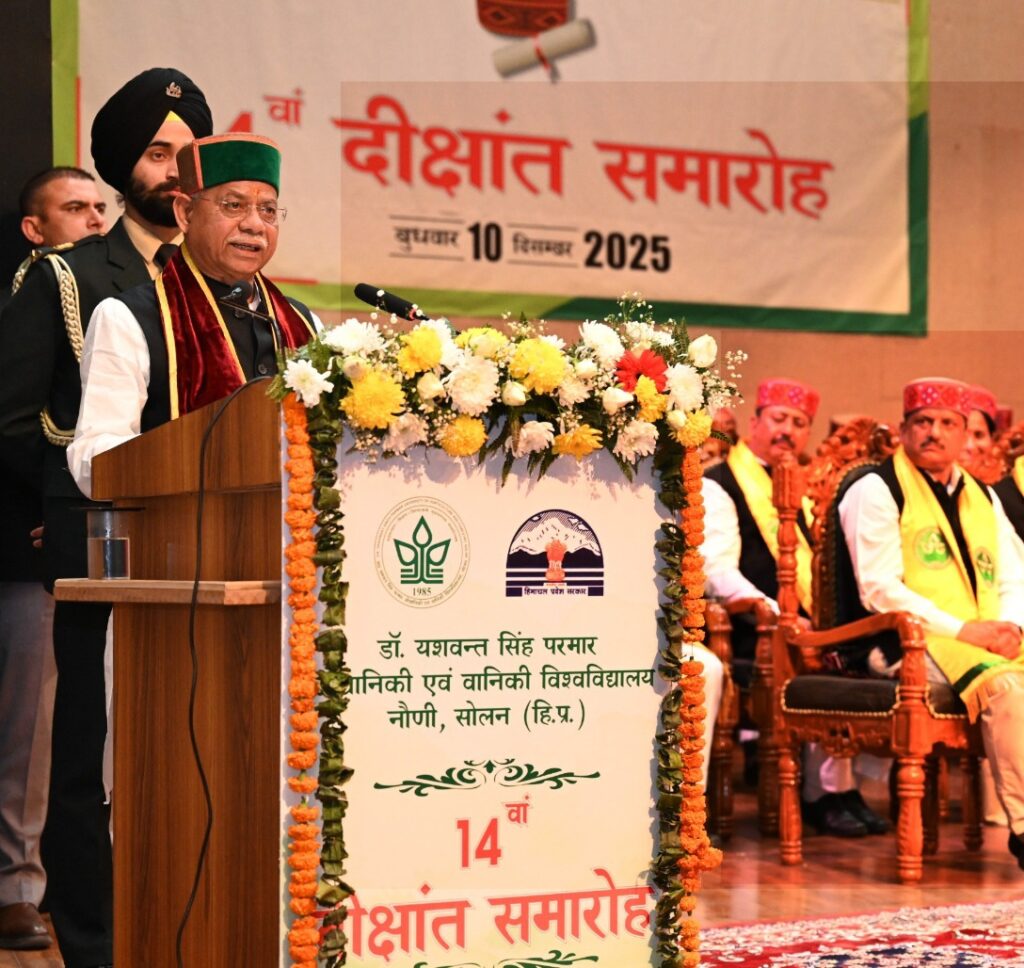 सोलन: राज्यपाल शिव प्रताप शुक्ल ने आज सोलन जिले के नौणी स्थित डॉ. यशवंत सिंह परमार औद्यानिकी एवं वानिकी विश्वविद्यालय (वाईएसपीयूएचएफ) के 14वें दीक्षांत समारोह की अध्यक्षता की। उन्होंने कुल 12 स्वर्ण पदक प्रदान किए, जिनमें से 9 स्वर्ण पदक छात्राओं को मिले। राज्यपाल ने 518 मेधावी प्रमाण पत्र तथा औद्यानिकी व वानिकी के 855 डिग्री वितरित कीं। वहीं डिग्री धारकों तथा उनके अभिभावकों को बधाई देते हुए शुक्ल ने कहा कि दीक्षांत समारोह केवल शैक्षणिक उपलब्धि का उत्सव नहीं है, बल्कि किसानों, समाज और राष्ट्र के प्रति नई जिम्मेदारी का बोध भी कराता है। उन्होंने ड्रैगन फ्रूट, एवोकाडो, ब्लूबेरी, मैकाडामिया नट, कॉफी आदि उच्च मूल्य फसलों के प्रोत्साहन तथा प्राकृतिक खेती को बढ़ावा देकर रसायनिक निर्भरता कम करने के लिए विश्वविद्यालय की पहल की सराहना की। राज्यपाल ने विश्वविद्यालय के उत्कृष्ट शोध कार्यों की प्रशंसा करते हुए बताया कि विश्वविद्यालय ने 334 शोध प्रकाशन, 10 पेटेंट तथा 11 राष्ट्रीय-अंतर्राष्ट्रीय समझौता ज्ञापन प्राप्त किए हैं। औषधीय पौधों, जैव-नियंत्रण तथा अन्य वैज्ञानिक क्षेत्रों में विश्वविद्यालय की उपलब्धियों और विशेषकर उत्कृष्ट प्रदर्शन करने वाली छात्राओं की उपलब्धियों की उन्होंने सराहना की। अपने राज्यव्यापी नशा विरोधी अभियान का उल्लेख करते हुए शुक्ल ने युवाओं से नशा मुक्त हिमाचल के निर्माण में सक्रिय भूमिका निभाने की अपील की। उन्होंने नशे के खिलाफ सरकार के प्रयासों की भी सराहना की। उन्होंने विश्वविद्यालय द्वारा राज्य में आयोजित जागरूकता गतिविधियों की सराहना की, जिनमें हजारों विद्यार्थी, किसान और आम नागरिक जुड़े। उन्होंने कहा कि अगले वर्ष से वह इस अभियान को घर-घर पहुंचाने का प्रयास करेंगे। राज्यपाल ने स्नातकों से आह्वान किया कि वे नैतिकता, संवेदनशीलता और जिम्मेदारी के साथ भविष्य की राह चुनें तथा नवाचार, उद्यमिता और किसानों की आर्थिक उन्नति में योगदान दें।